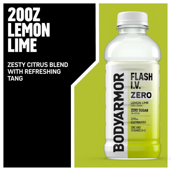 - 12 pack. 20 fl oz bottles of BODYARMOR Flash I.V. Zero Sugar Lemon Lime sports drinks for sustained hydration
