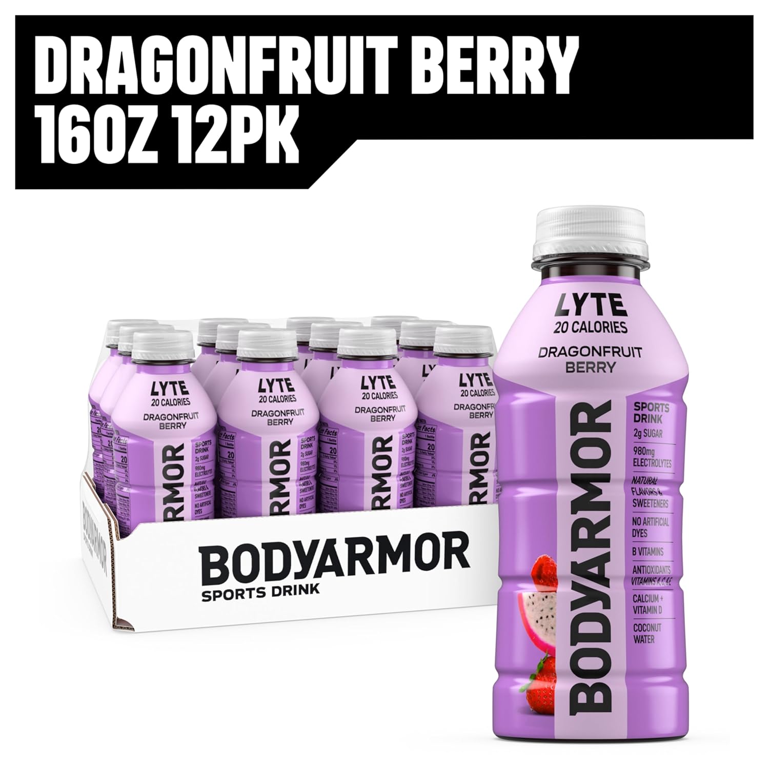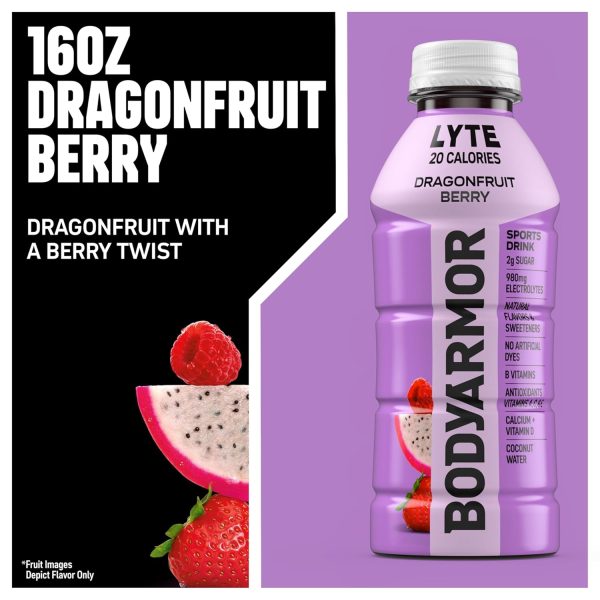 - 12 pack. 16 fl oz bottles of BODYARMOR Lyte Dragonfruit Berry electrolyte drinks for hydration that keeps pace with your active lifestyle