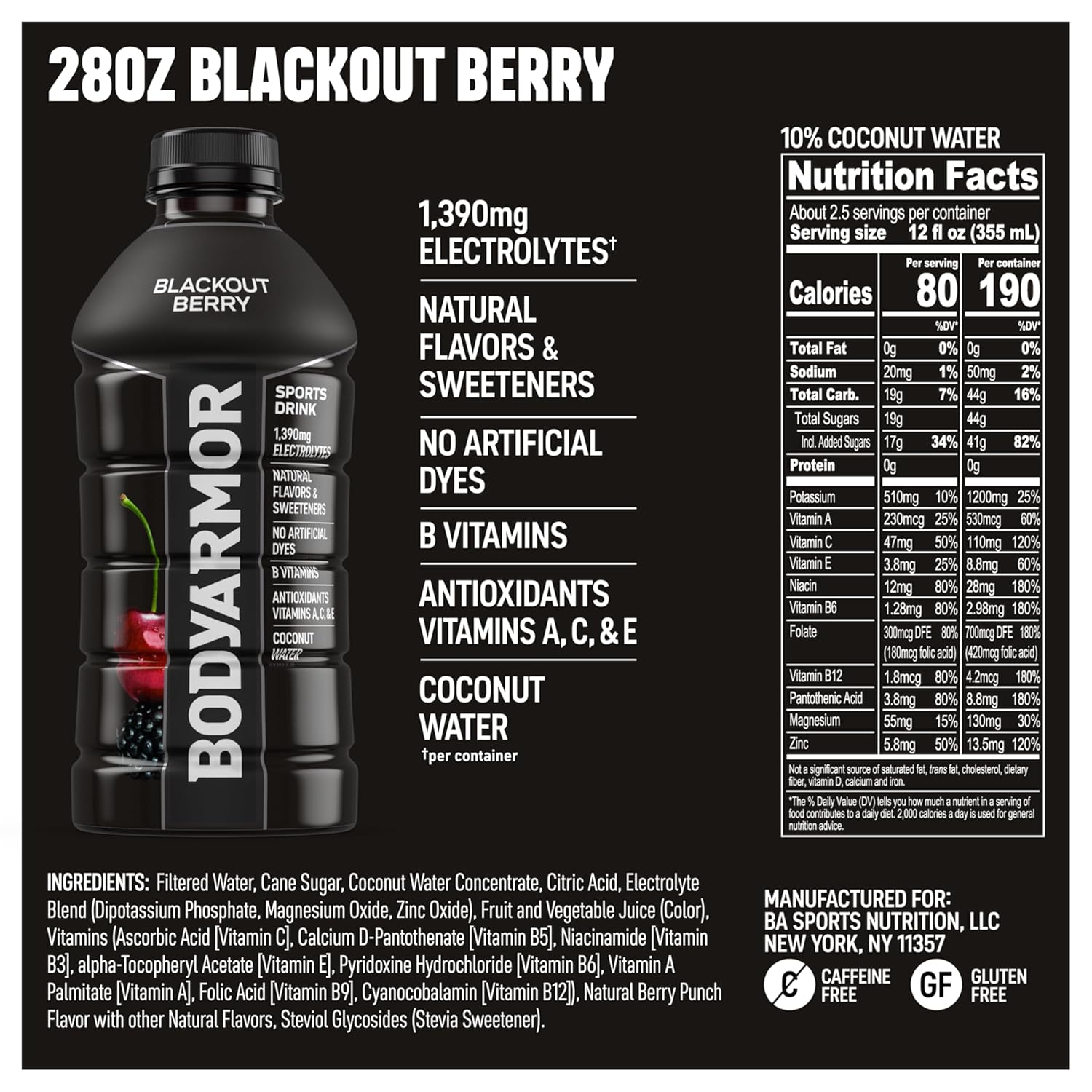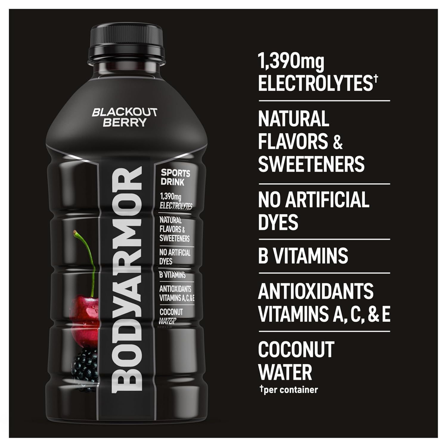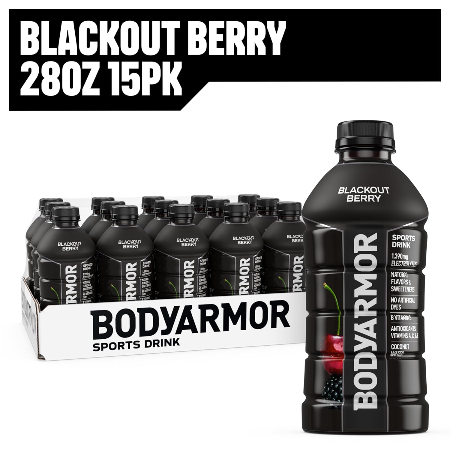 - 15 pack. 28 fl oz bottles of BODYARMOR Sports Drink Blackout Berry ?? hydration’s MVP