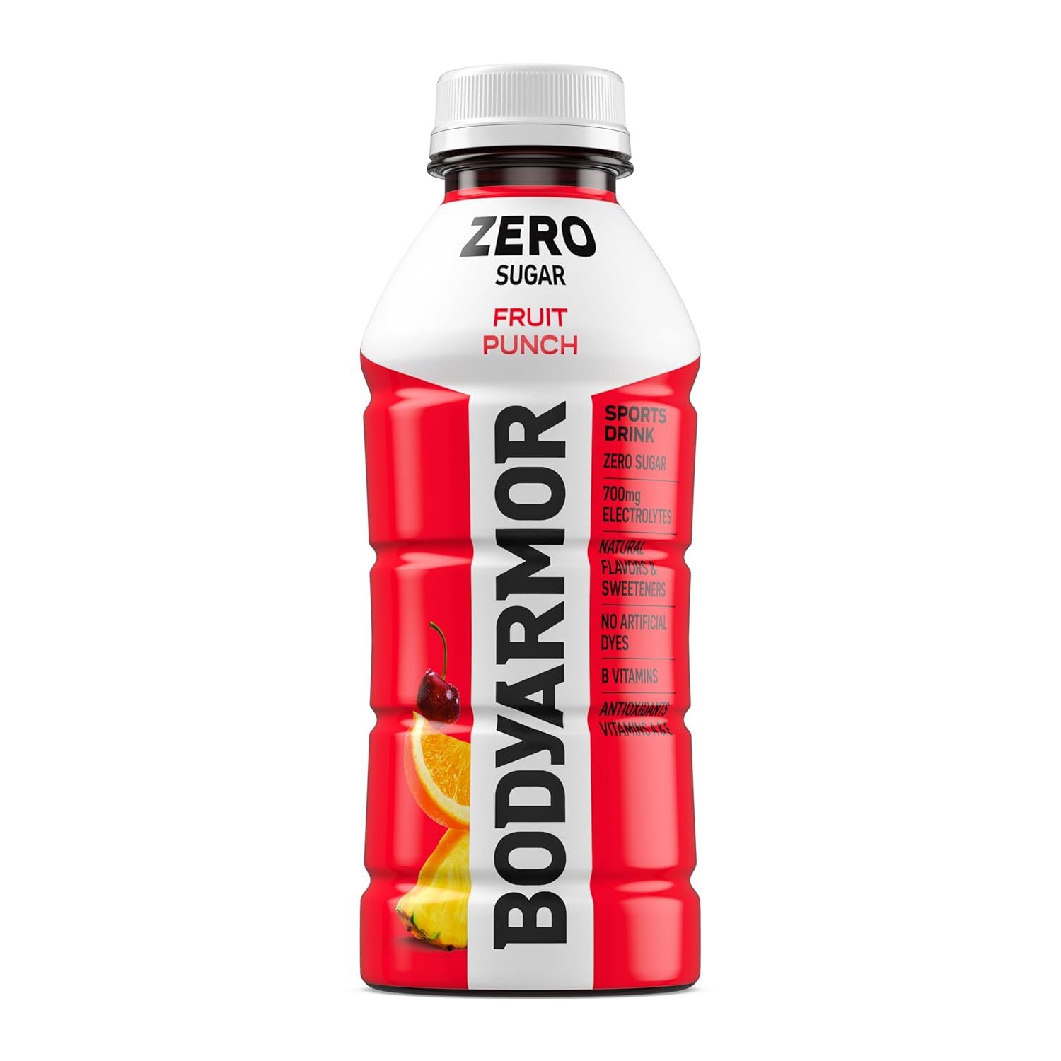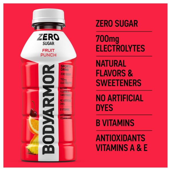 - 12 pack. 16 fl oz bottles of BODYARMOR Zero Sugar Fruit Punch electrolyte drinks to refresh your relentless drive all day. every day