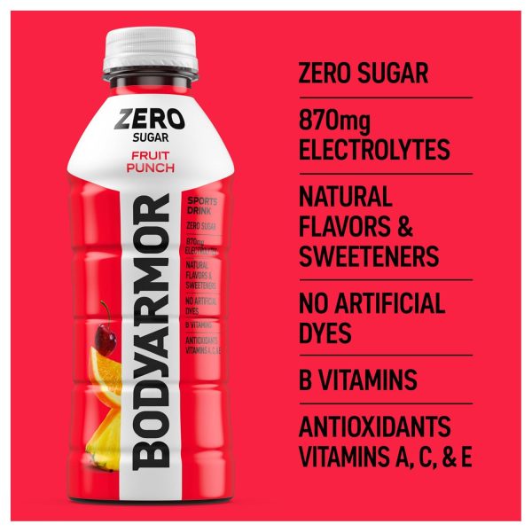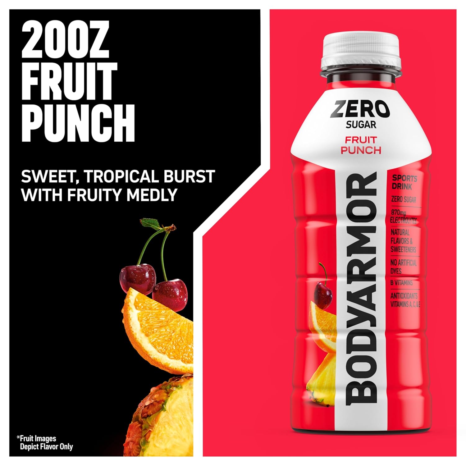- 6 pack. 20 fl oz bottles of BODYARMOR Zero Sugar Fruit Punch electrolyte drinks to refresh your relentless drive all day. every day