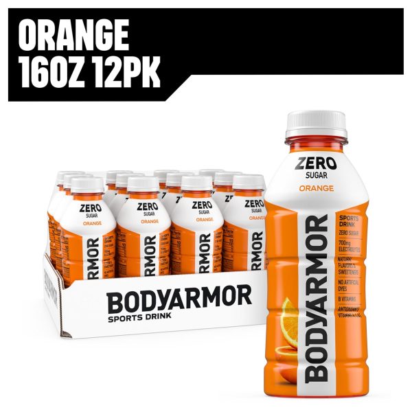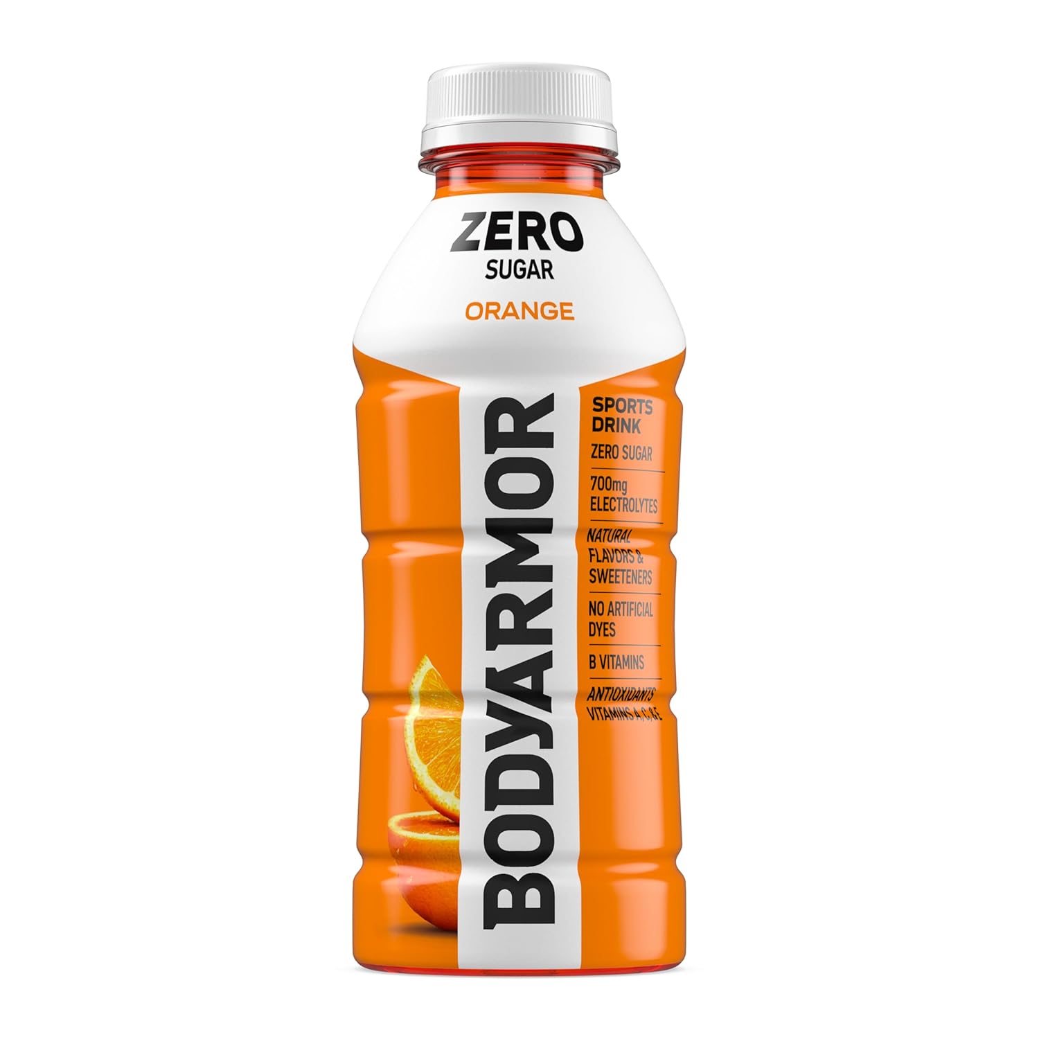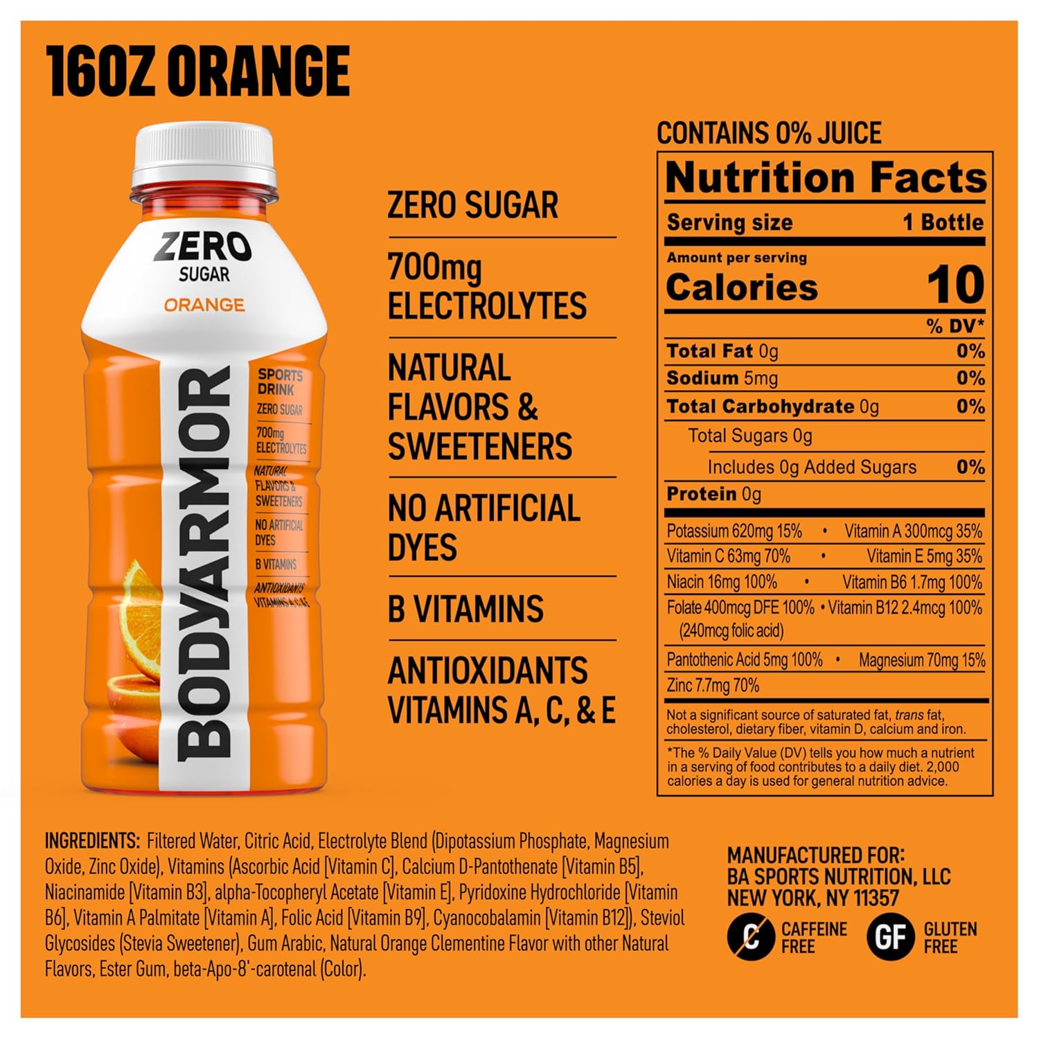 - 12 pack. 16 fl oz bottles of BODYARMOR Zero Sugar Orange electrolyte drinks to refresh your relentless drive all day. every day